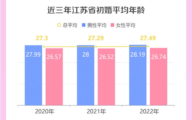 分类型看,初婚平均年龄为27.49岁,其中男性28.19岁、女性26.74岁。27.49岁的初婚年龄与2021年的27.29岁相比,又推迟了0.2岁。
