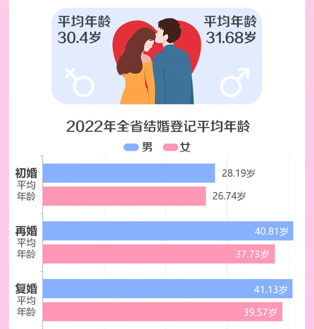 2022年全省结婚登记平均年龄为31.04岁,其中男性31.68岁、女性30.4岁。