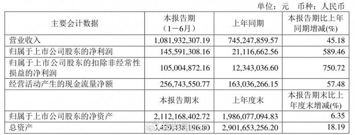 报告期内,公司实现营业收入 108,193.23 万元,同比增长 45.18%;实现归属于上市公司股东的净利润 14,559.13 万元,同比增长 589.46%;归属于上市公司股东的扣除非经常性损益的净利润10,500.49万元,同比增长 750.72%;实现经营活动产生的现金流量净额25,674.36万元,同比增长 57.48%。