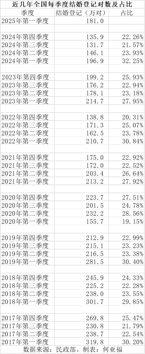 民政部发布数据,2025年一季度全国结婚登记量为181万对,较去年同期减少了15.9万对,再创同季新低;离婚登记增加5.7万对。