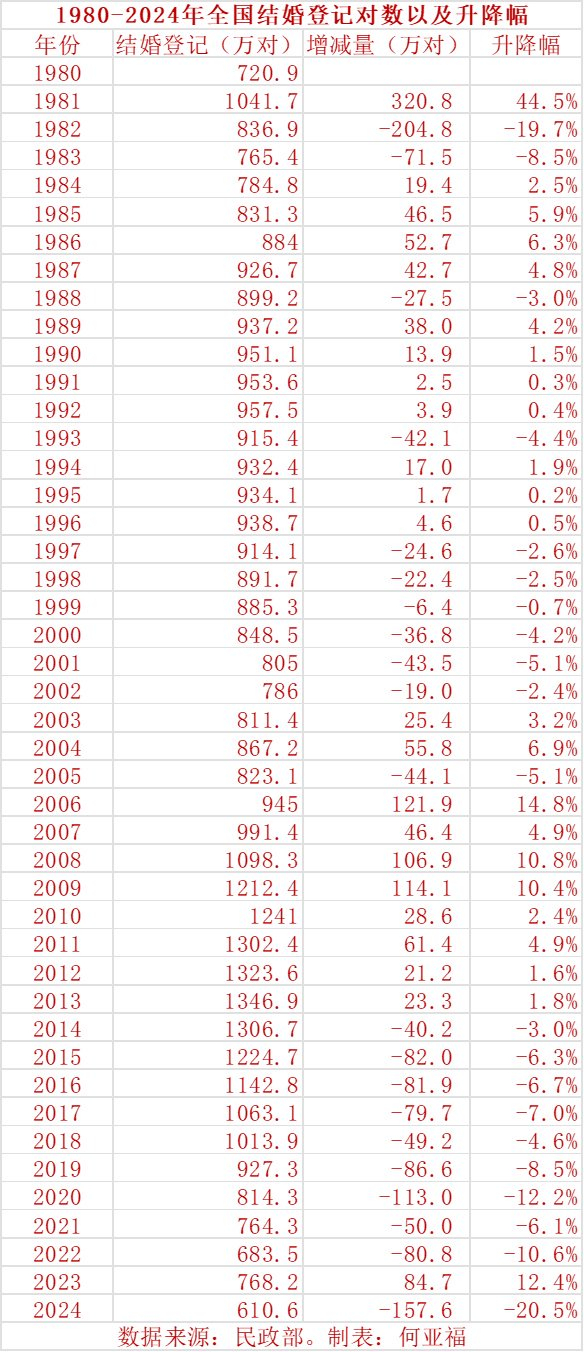上表是1980-2024年全国结婚登记对数、增减量和升降幅。表中的增减量和升降幅均是指与上一年相比。可以看出,2024年结婚登记比上一年减少157.6万对,降幅为20.5%,是1980年以来结婚登记对数降幅最大的一年。