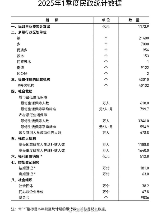 近日,民政部发布2025年1季度民政统计数据!