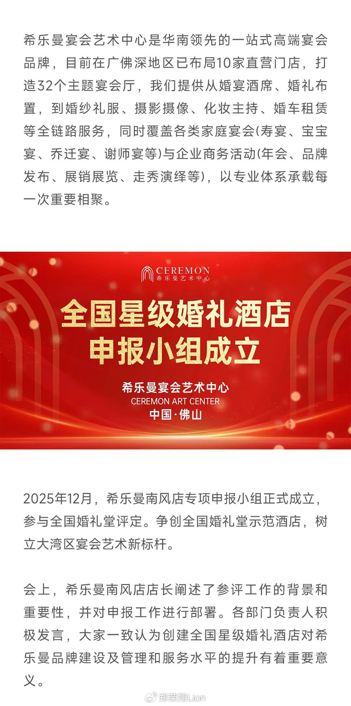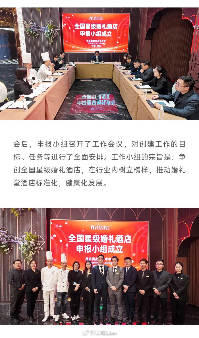 希乐曼是华南领先的一站式高端宴会品牌,已布局10家直营门店,现佛山店正式成立申报小组,争创全国婚礼堂示范酒店。