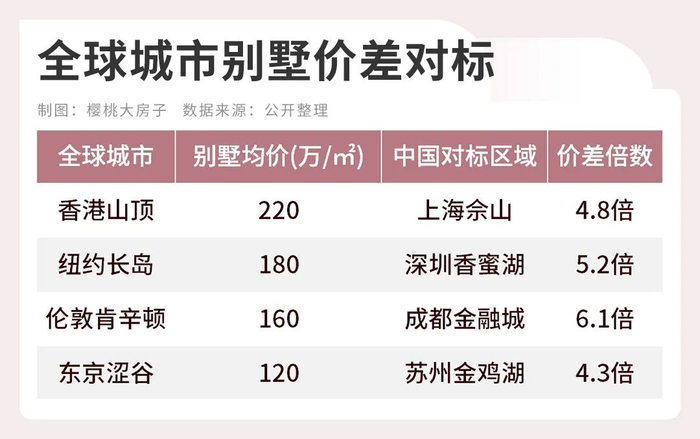 香港山顶、纽约长岛、伦敦肯辛顿等国际顶级豪宅区的单价已达120万-220万/㎡,而中国北上广深等城市的顶级别墅均价仍在20万-70万/㎡区间,价差高达3-6倍。