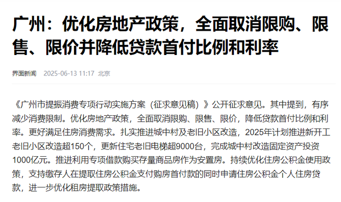 同日,广州宣布,优化房地产政策,全面取消限购、限售、限价,降低贷款首付比例和利率,更好地满足住房消费需求。
