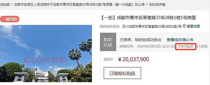 2024年4月,麓湖「麒麟荟」一套法拍别墅吸引17位买家角逐,最终以1.2亿成交;2025年2月,青羊区一套别墅经历抬价359次后方才落槌。
