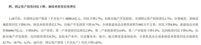 工业增加值同比从9月的6.5%回落至4.9%;固定资产投资这个传统的经济压舱石,同比下降了1.7%,环比下降1.62%;民间投资同比下降4.5%;就连一直比较稳的基础设施投资,也罕见地出现了0.1%的下降。