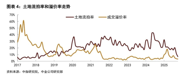 销售端的冷空气传导到土拍市场,土地成交额同比大幅下降,成交溢价率也有所回落。10月全国住宅土拍建筑面积6878万㎡,环比增长2%、同比下降40%;成交建筑面积5563万㎡,环比下降5%、同比下降33%。10月土地成交平均溢价率仅3%,几乎就是底价成交。