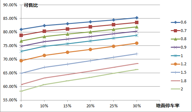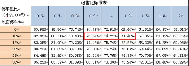 备注:一般情况下,地面停车率的上线指标都是10%,大多数地区要求的车位配比都在0.9-1.2个/100m2左右,所以正常的可售比指标大约在75%左右。