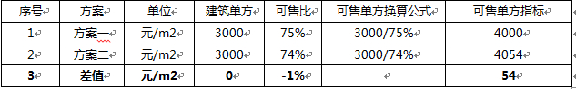 通过以上对比可知,可售比降低1%,可售单方指标约提高54元/m2,在单方售价不变的情况下,项目利润将会降低;