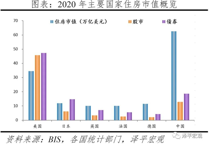 从居民财富效应渠道,根据我们的《中国住房市值测算报告》,2020年中国住房市值为62.6万亿美元,明显大于美国的33.6万亿美元、日本的10.8万亿美元、英法德三国合计的31.5万亿美元。从住房市值与GDP的比例看,2020年中国为414%,高于美国、日本、德国、英国、法国的148%、233%、271%、339%、354%。从住房市值占股债房市值的比例看,2020年中国为66.6%,高于美国的27%、日本的37%、英国的49%、法国的56%、德国的64%。中国住房市值与股债房市值的比例较高,主要是因为住房市值高,以及中国资本市场发育尚不成熟,直接融资比例较低,股票、债券市值较低,居民投资渠道缺乏。