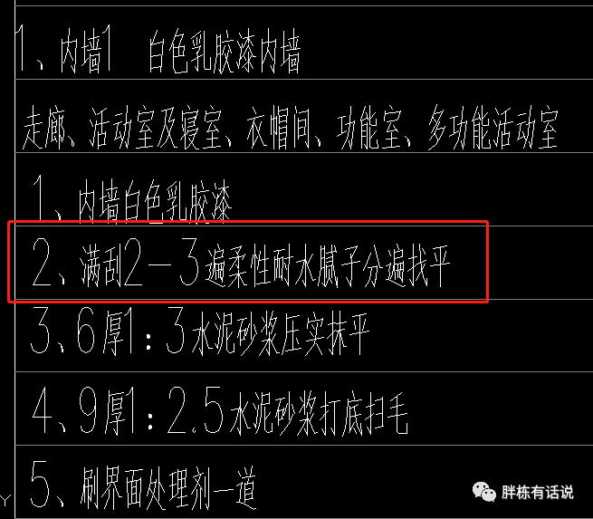 【案例】:考虑到一些功能空间没有涉水隐患,耐水腻子可改为普通的柔性腻子,但是对地下空间及室内三小间建议采用耐水腻子或防水腻子