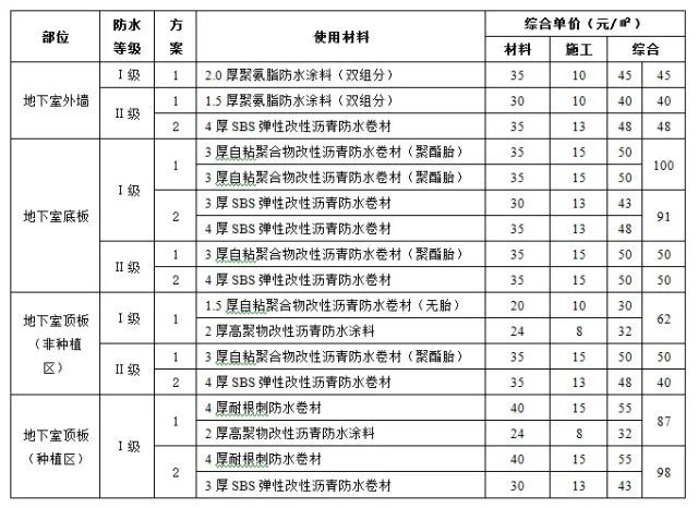 (2)防水建面单方参考:地上建面单方 25 元/㎡(地上建筑面积),地下部分建面单方 180 元/㎡(地下室建筑面积)。
