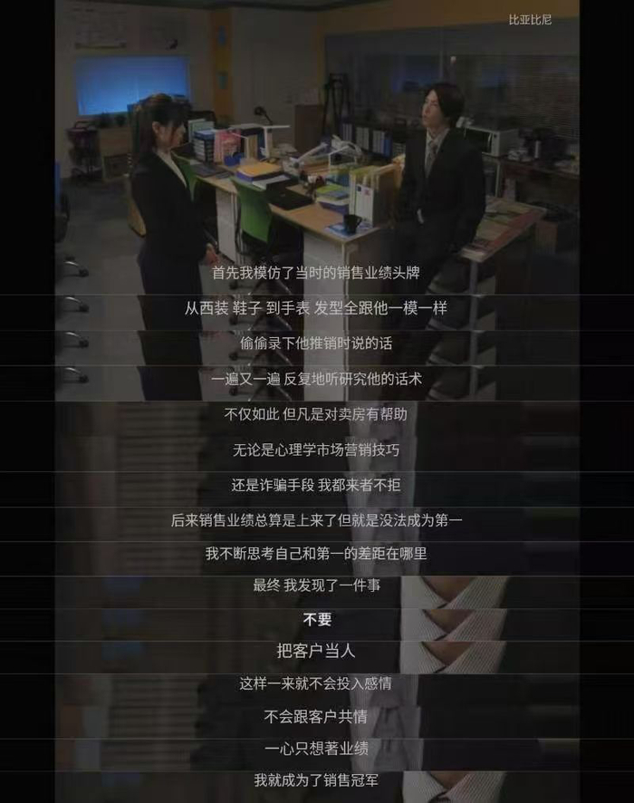 以前的永濑,不把客户当人看,一心只想着业绩,让他成了销冠。一段时间里,他的业绩一直稳居公司第一位,但是同事和业内同行都叫他“骗子永濑”。