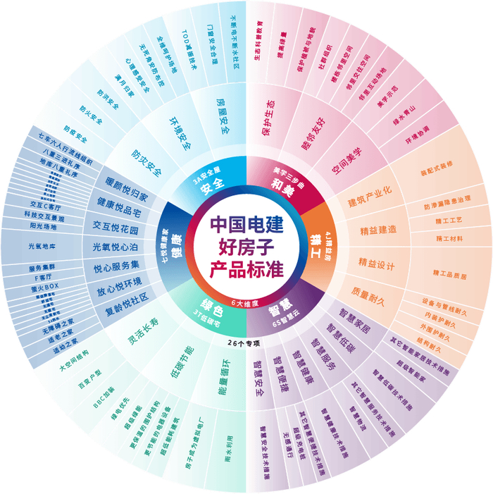 中国电建地产认为,「好房子」标准的核心在于「以人为本」,围绕这一核心点,中国电建地产打造出「安全、健康、绿色、智慧、精工、和美」6大主线,通过维度拆解,做出26个专项、75个控制要点、165个技术参数。不仅包含了今年政府工作报告中「好房子」的「四要素」,而且更加细致和具体。