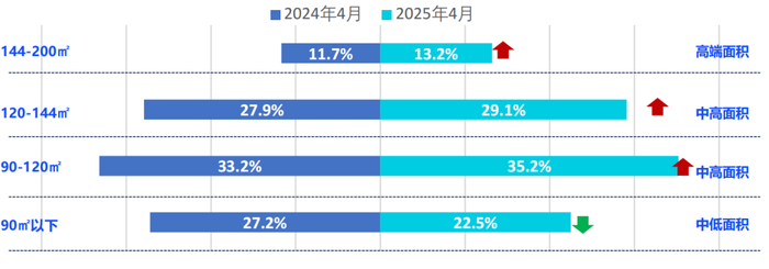 从大盘数据来看,目前市场上改善型产品成交份额有明显提高,房子已然回归居住属性。今年4月,90平以上面积成交占比达77.5%,同比增长5%。