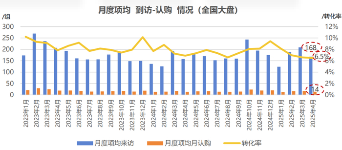 也有数据显示,2025年4月项目平均到访数168组、项均认购14组,整体转化率6.5%,呈下降趋势。而自2024年开始,整体转化率一直低于10%。