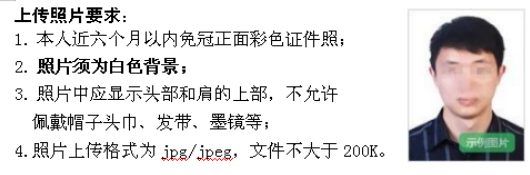 3.上传照片:照片将用于准考证以及考试合格证明,请考生上传照片时慎重选用。照片不得开美颜及美化修图,不符合证件照标准的照片不能通过审核。