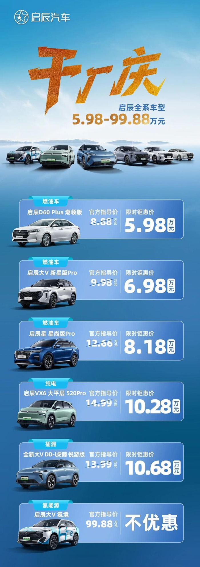 具体来看,活动期间启辰D60 PLUS 潮领版限时钜惠价5.98万元;启辰大V 新星版Pro限时钜惠价6.98万元;启辰星 星尚版Pro限时钜惠价8.18万元;启辰VX6 大平层 520Pro限时钜惠价10.28万元;启辰大V DD-i虎鲸 悦游版限时钜惠价10.68万元;启辰大V 氢境不优惠官方指导价99.88万元。