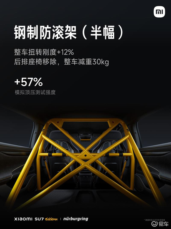 SU7 Ultra纽北限量版搭载价值10万元的赛道专业套装,包含倍适登EVO R for Ultra绞牙减振器套装、1.7平米碳纤维车顶、碳纤维后轮眉、倍耐力P ZEROTM TROFEO RS半热熔轮胎、ENDLESS MA45B高性能制动片、21"U型锻造轮毂、倍耐力P ZERO第五代高性能轮胎、碳纤维双风道前舱盖、碳纤维固定式大尾翼、碳纤维空气动力学底护板(可增加44kg下压力)、高性能版碳纤维赛车桶椅以及钢制防滚架(半幅)。