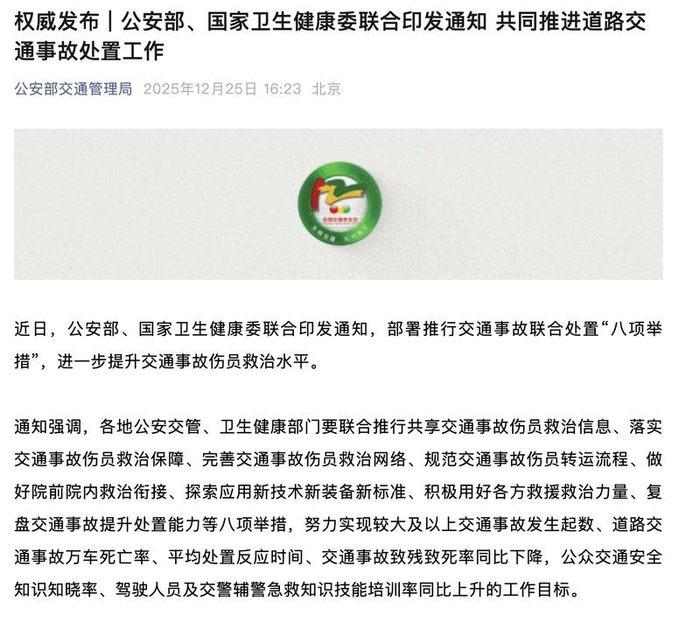 易车讯 近日,公安部、国家卫生健康委联合印发通知,部署推行交通事故联合处置“八项举措”,进一步提升交通事故伤员救治水平。