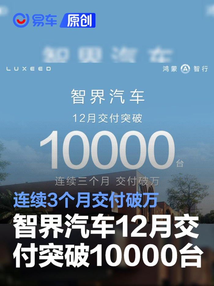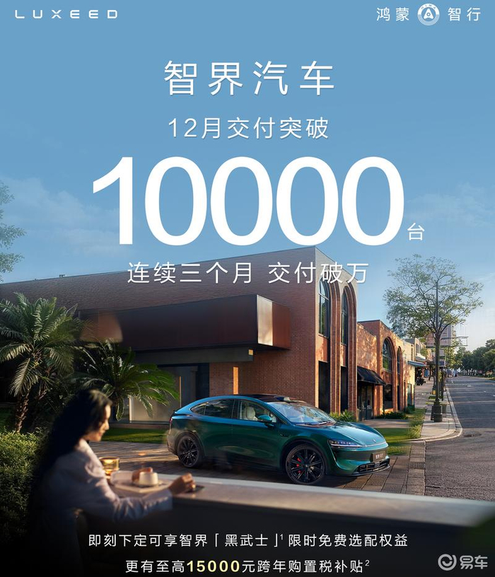 易车讯 12月29日,鸿蒙智行官方发布,智界汽车12月交付突破10000台,连续3个月交付破万。12月31日24:00前完成大定锁单,可享至高15000元跨年购置税兜底补贴。