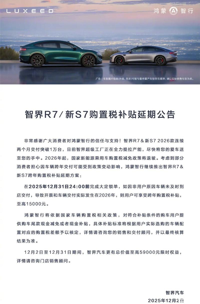 12月2日,鸿蒙智行智界汽车官方宣布,考虑到部分消费者担心因车辆跨年交付可能受到政策变动影响,鸿蒙智行继续推出智界R7&新S7跨年购置税补贴延期方案。智界R7&新S7 2026款连续两个月交付突破1万台,目前智界超级工厂正在全力提拉产能。