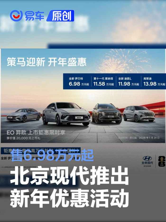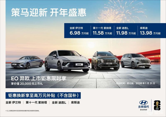 易车讯 日前,北京现代开启“策马迎新 开年盛惠”主题活动,旗下四款核心燃油车型全新伊兰特、第十一代索纳塔、全新途胜L、库斯途起售价分别来到6.98万元起、11.58万元起、11.98万元起及13.98万元起,置换用户可额外享受最高万元的换新补贴(不含国补)。纯电SUV EO羿欧起售价11.98万元起,可叠加限时享价值20000元的上市礼。