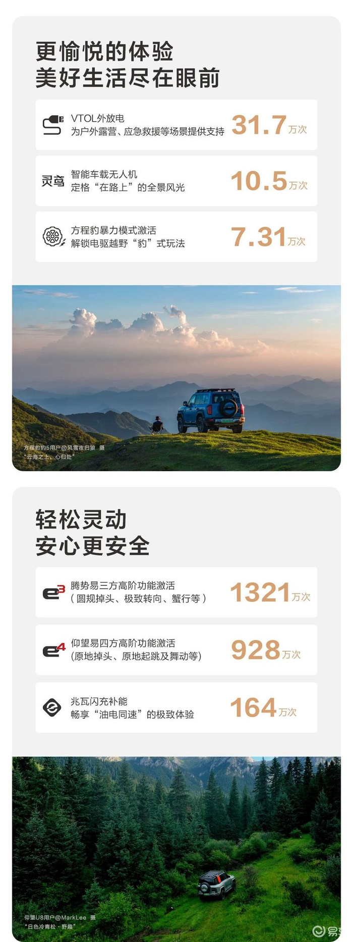 VTOL外放电为户外露营、应急救援等场景提供支持31.7万次,智能车载无人机使用10.5万次,方程豹暴力模式激活7.31万次,腾势易三方高阶功能激活1321万次,仰望易四方高阶功能激活928万次,兆瓦闪充补能164万次。