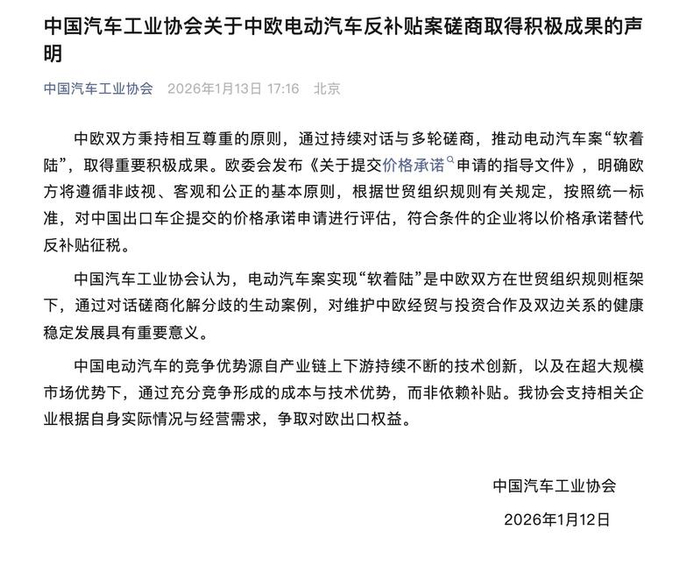 易车讯 1月12日,中国汽车工业协会发布了关于中欧电动汽车反补贴案磋商取得积极成果的声明。中汽协在生命中表示,中欧双方秉持相互尊重的原则,通过持续对话与多轮磋商,推动电动汽车案“软着陆”,取得重要积极成果。欧委会发布《关于提交价格承诺申请的指导文件》,明确欧方将遵循非歧视、客观和公正的基本原则,根据世贸组织规则有关规定,按照统一标准,对中国出口车企提交的价格承诺申请进行评估,符合条件的企业将以价格承诺替代反补贴征税。