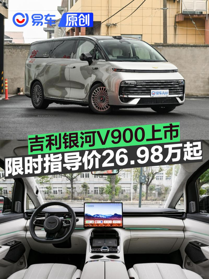 易车讯1月20日,吉利银河V900正式上市,包含三款车型,官方指导价区间30.98-36.98万元;上市限时指导价区间26.98-32.98万元。新车定位为大型MPV,车长超过5.3米,采用1.5T增程式动力。