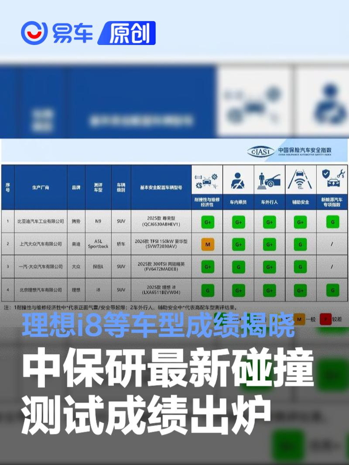易车讯 1月21日,中保研汽车技术研究院发布中国保险汽车安全指数(C-IASI)2025年测评车型第二次结果。本次结果发布共涉及4款车型,包括“腾势N9、奥迪A5L Sportback、大众探岳L、理想i8”。