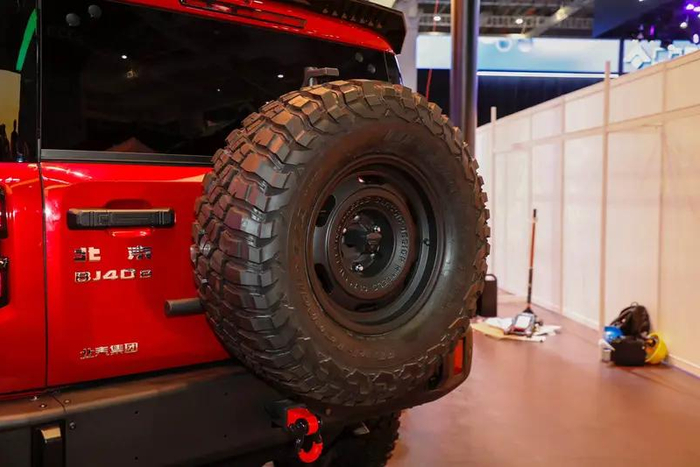 同时在车顶加装了顶框式的行李架,扩展整体的载物能力,保证人员物资的最大化装载。而涉水喉的加装,BJ40增程应对更多的野外穿越。尾部方面,前后拖车钩的到强化,并配备外挂式备胎。