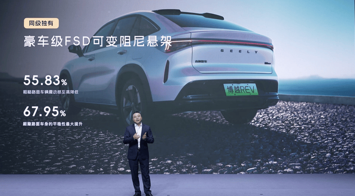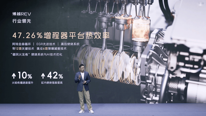 动力方面,博越REV 实现了CLTC 纯电续航375km,综合续航1525km,首发11合1增程电驱系统,增程器搭载阿特金森循环、EGR技术与“御风火龙卷”高效燃烧系统,12项关键技术加持,热效率高达47.26%,1L油可高效发电3.77度,馈电油耗低至4.95L/100km。