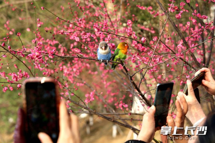 长沙晚报掌上长沙2月2日讯(全媒体记者 贺文兵)今日,长沙天气晴好,湖南烈士公园年嘉湖畔的红梅林正值盛花期,嫣红花朵缀满枝头,与澄澈湖水相映成趣。一对色彩艳丽的鹦鹉落在梅花枝桠上,歪头晒太阳的萌态吸引不少人围观拍照,为冬日赏梅添了几分灵动生机。