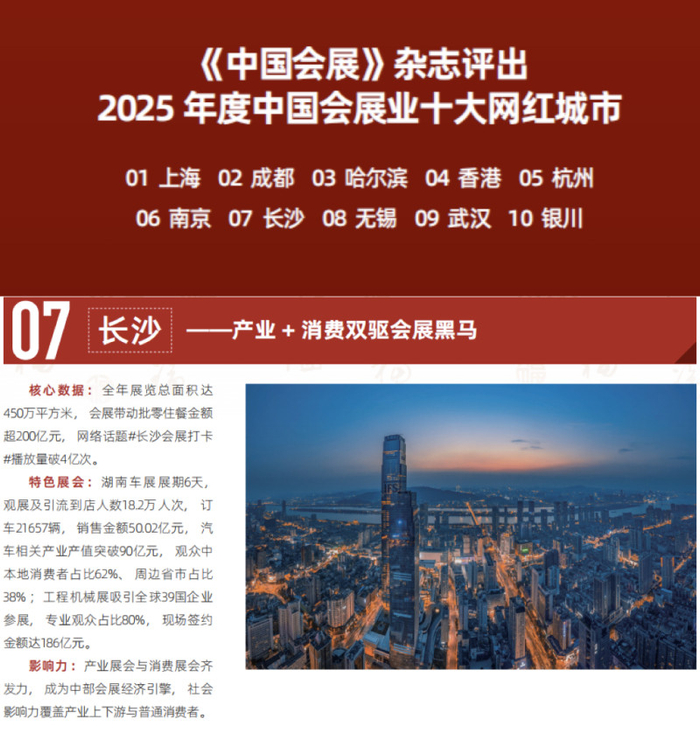 长沙晚报掌上长沙2月3日讯(全媒体记者 贾凯清 通讯员 王旭)近日,由国家发改委主管的《中国会展》杂志评出《2025年度中国会展业十大网红城市》,长沙以“产业+消费双驱会展黑马”获评“中国会展业十大网红城市”。