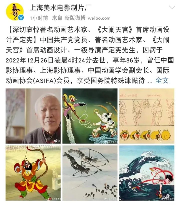 昨日,上海美术电影制片厂在微博上发布消息,著名动画艺术家、《大闹天宫》首席动画设计、一级导演严定宪因病于2022年12月26日凌晨4时24分去世,享年86岁。