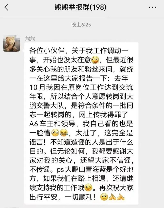 熊警官在微信群的辟谣至于部分网友发布的“熊警官查处奥迪A6”的相关视频和图片,记者查阅资料发现,相关配图为今年5月哈尔滨交警查处交通违法的新闻,与熊警官并无关联。