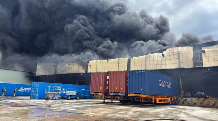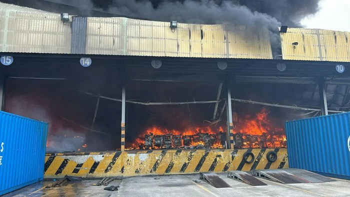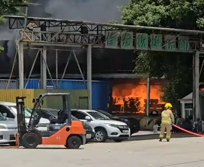 网上流传的片段显示,物流中心的单层仓库起火,全层几乎陷入火海,滚滚浓烟冒出。