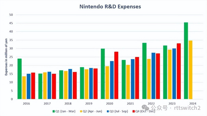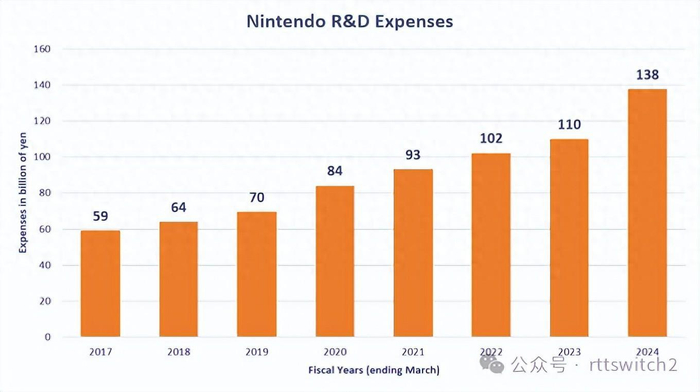 根据他分享的信息,在截至 2024 年 3 月的一个财年内,任天堂在研发(R&D)上花费了 1380 亿日元,创下了公司史上新高。虽然公司近年来的研发费用都在不断上涨,但 2023 财年至 2024 财年的增幅比也是最高的。