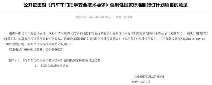 就在昨天,工信部启动《汽车车门把手安全技术要求》强制性国家标准的意见征集,目的在于解决新能源汽车智能化进程中,隐藏式门把手暴露的安全隐患,并公示截止日期为2025年6月7日。