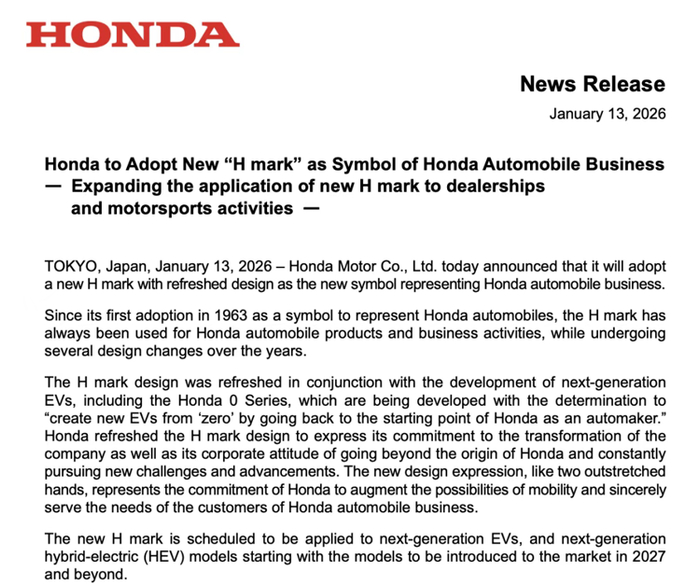 近日本田正式官宣,2027年起将全面换上全新LOGO,从混动、燃油车到赛车,甚至经销商门店和宣传物料都将同步更新。