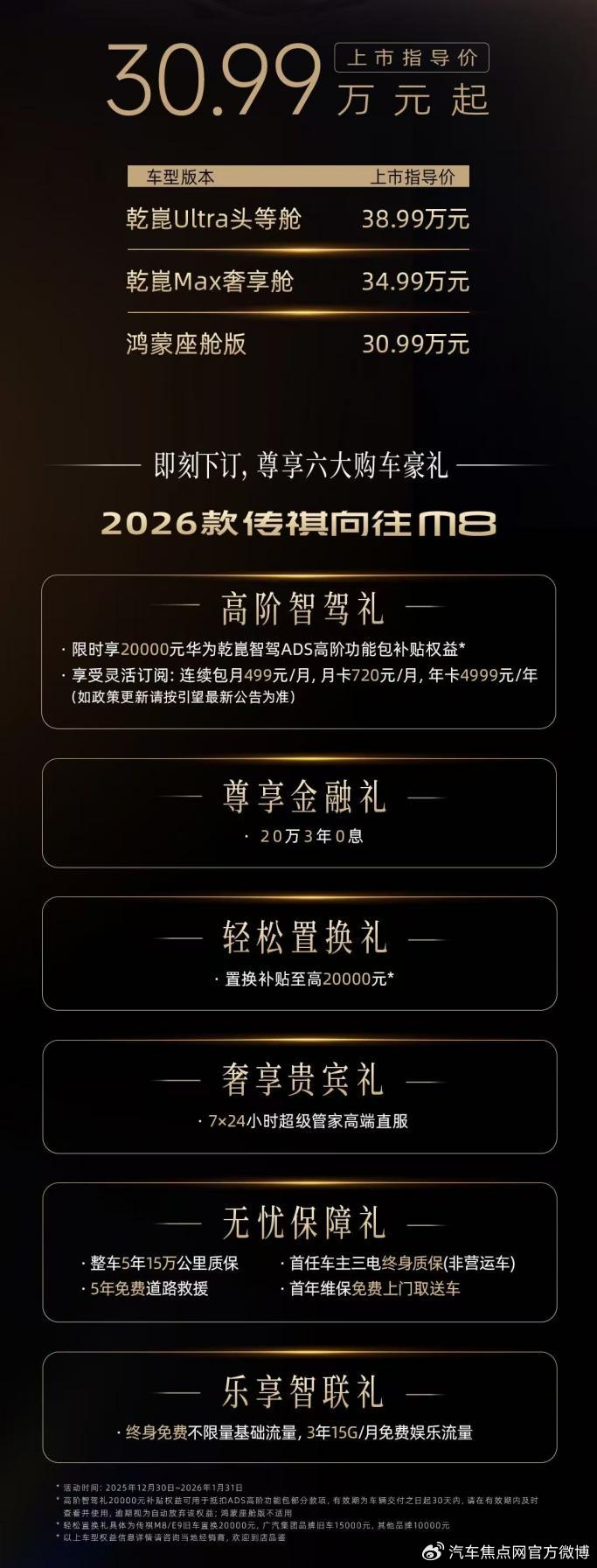 2025年12月30日,正值传祺M8上市八周年之际,2026款传祺向往M8感恩上市,新车上市指导价30.99万元起,限时补贴价仅28.99万元。为回馈广大用户的长期信赖与支持,即日起下订即可尊享六大专属礼包:置换补贴至高20000元、限时享20000元华为乾崑智驾ADS高阶功能包补贴权益,以及20万3年0息金融礼等丰厚权益。