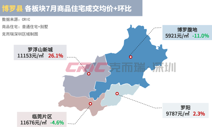 价格方面,全市网签均价约11453元/㎡,环比下降5.8%。分区域来看,仅博罗和龙门县网签均价环比上涨,其他5个县区的房价环比均下降,大亚湾是房价最高的区域,均价约13605元/㎡,环比持续下降1.8%。
