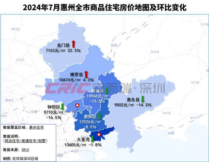 7月,惠州全市商品住宅只有4个区县有10个项目新增供应,共1902套房源,环比上涨91%,其中大亚湾供应1253套,其次是惠城区供应411套、惠阳区120套、龙门县118套。