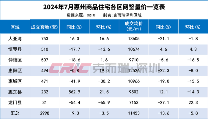 成交方面,惠州全市共网签成交2998套,环比下降3.5%,同比下降9.3%,其中大亚湾网签最多共753套,其他县区网签量依次是博罗县510套、仲恺区507套、惠阳区494套、惠城区471套、惠东县232套,龙门县网签不足百套,仅网签31套。单项目看,仅2个项目网签超百套。