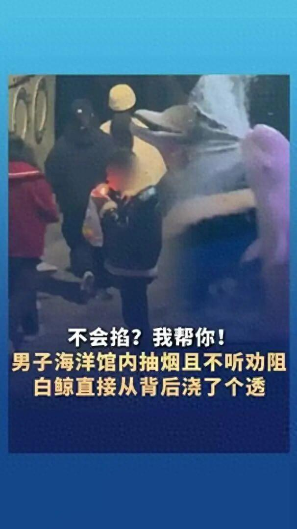 近日,大连一男子海洋馆内抽烟且不听劝阻,白鲸直接从其背后喷水,把男子浇了个透。