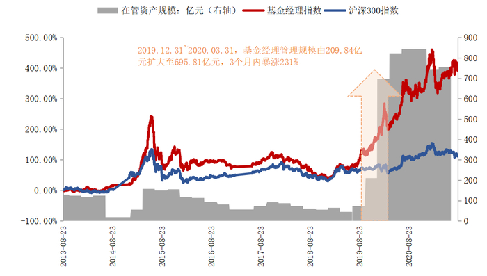 经理指数第三阶段:2019.01~至今,业绩推动规模暴涨、净值线不断创新高