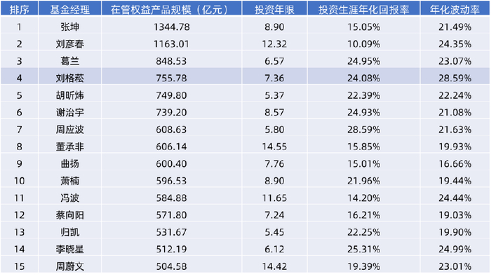 截至2021年二季度末,公募市场上在管权益产品规模合计超500亿元的基金经理仅有15名,而刘格菘则是其中排名靠前的一位。自2013年8月管理第一只基金以来,刘格菘在7.36年的投资年限里实现了24.08%的年化回报率,权益管理总规模攀升至第四名,堪称公募基金行业的“顶流人物”。