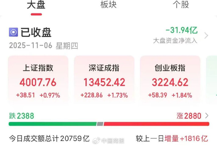 中国商报(记者 王彤旭)11月6日,A股三大指数集体上涨。截至收盘,上证指数涨0.97%,深证成指涨1.73%,创业板指涨1.84%。沪深京三市全天成交额为20759亿元,较上一日增量1816亿元。全市场超2800只个股上涨。在板块题材上,磷化工、存储芯片、农药、CPO等板块涨幅居前。